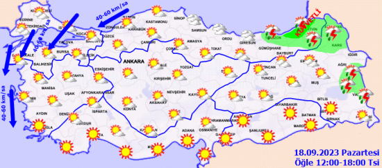 Kuvvetli Rüzgar Uyarısı: Rüzgarın, Batı Karadeniz kıyıları, Marmara, Ege kıyıları ve Kuzey Ege ile Akdeniz'in iç kesimlerinde kuzeyli yönlerden kuvvetli (40-60 km/saat) esmesi beklendiğinden yaşanabilecek olumsuzluklara karşı vatandaşların ve ilgililerin dikkatli ve tedbirli olmaları gerekmektedir.