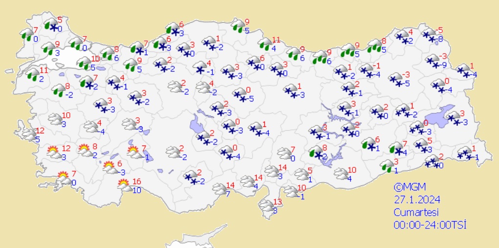 Bugün yurdumuzun birçok yöresinin karlar altında kalmasına rağmen, Antalya, Muğla, Denizli, İzmir ve Manisa'nın güney kesimlerinde güney yüzünü gösterecek. Ancak buna rağmen Antalya'daki en yüksek sıcaklık değeri 16°C seviyelerini aşmayacak.