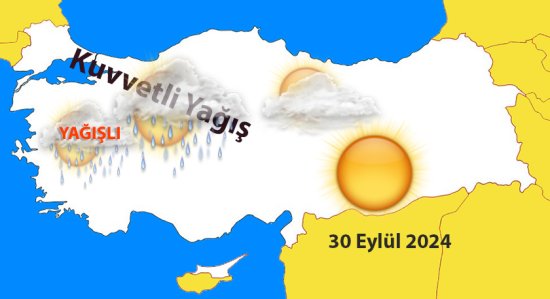 Meteoroloji Genel Müdürlüğü tarafından yapılan son tahminlere göre: Ülkemiz genelinin parçalı yer yer çok bulutlu, Marmara'nın doğusu, İç Ege, Akdeniz, İç Anadolu, Batı ve Orta Karadeniz, Kırklareli, İzmir, Rize, Erzurum, Bingöl ve Hakkari çevreleri, Tekirdağ'ın doğusu, Artvin’in iç ve kıyı kesimleri ile Trabzon'un doğu ilçelerinin sağanak ve gök gürültülü sağanak yağışlı geçeceği tahmin ediliyor. Yağışların; Marmara'nın doğusu, Kuzey Ege'nin iç kesimleri, İç Anadolu, Batı ve Orta Karadeniz ile Isparta'nın doğusu ve Antalya'nın doğusunun iç kesimlerinde yerel kuvvetli olması bekleniyor. Rüzgârın; Marmara’nın Doğusu, Batı Karadeniz, İç Anadolu’nun kuzey ve batı kesimleri ile Batı Akdeniz ve Güney Ege kıyılarında kuzeybatı yönlerden kuvvetli rüzgar ve yer yer fırtına şeklinde (50-70 km/saat) esmesi bekleniyor.